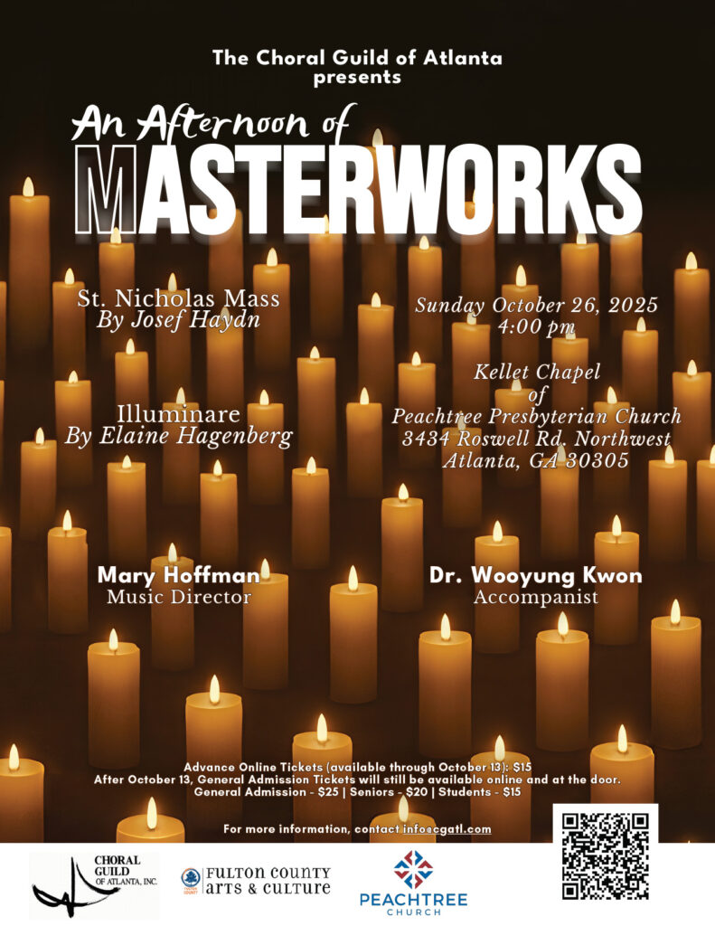 - 2025 Fall Concert – MasterworksJoin the Choral Guild October 26 for a performance of the St. Nicholas Mass by Joseph Haydn and “Illuminare” by Elaine Hagenberg. Sunday, October 26, 20254:00 PM Kellet ChapelPeachtree Presbyterian Church3434 Roswell RdAtlanta, GA 30305